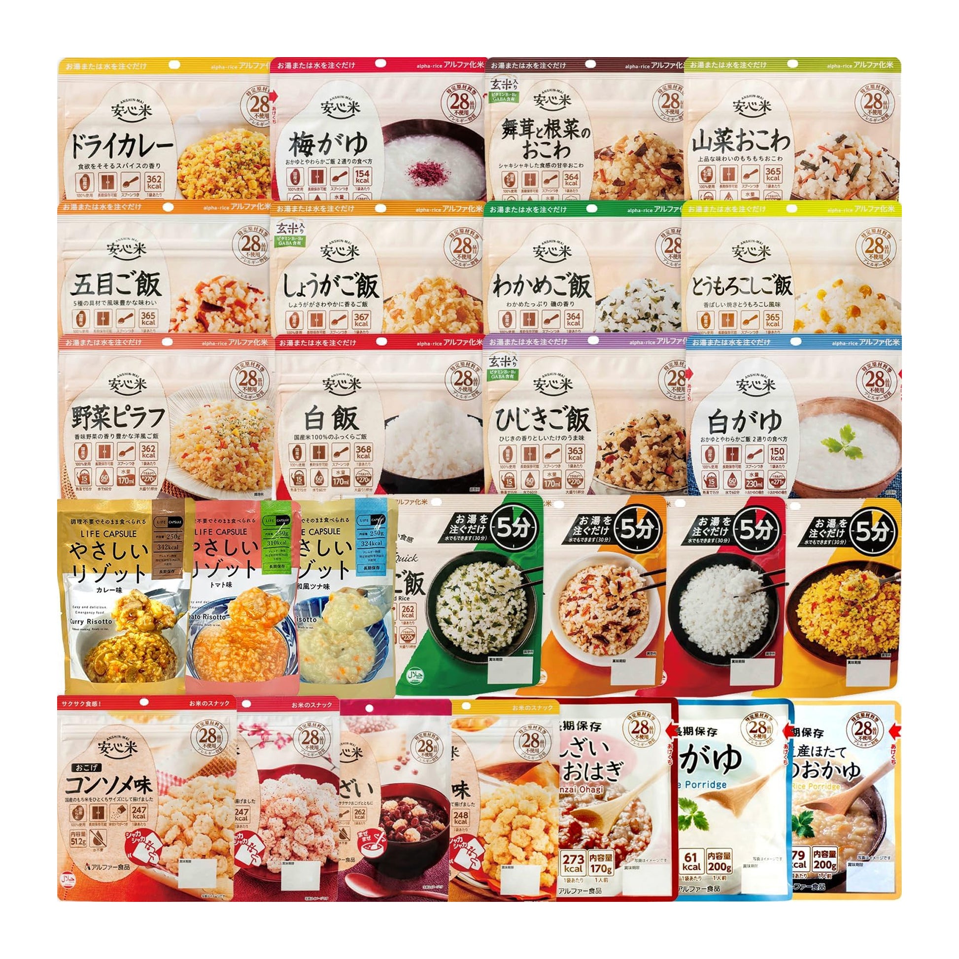 LIFE CAPSULE やさしいリゾット/トマト、LIFE CAPSULE やさしいリゾット/カレー、LIFE CAPSULE やさしいリゾット/和風ツナ、安心米おこげ/カレー味、安心米おこげ/コンソメ味、安心米おこげ/梅味、安心米おこげ/ぜんざい