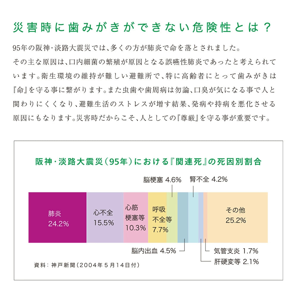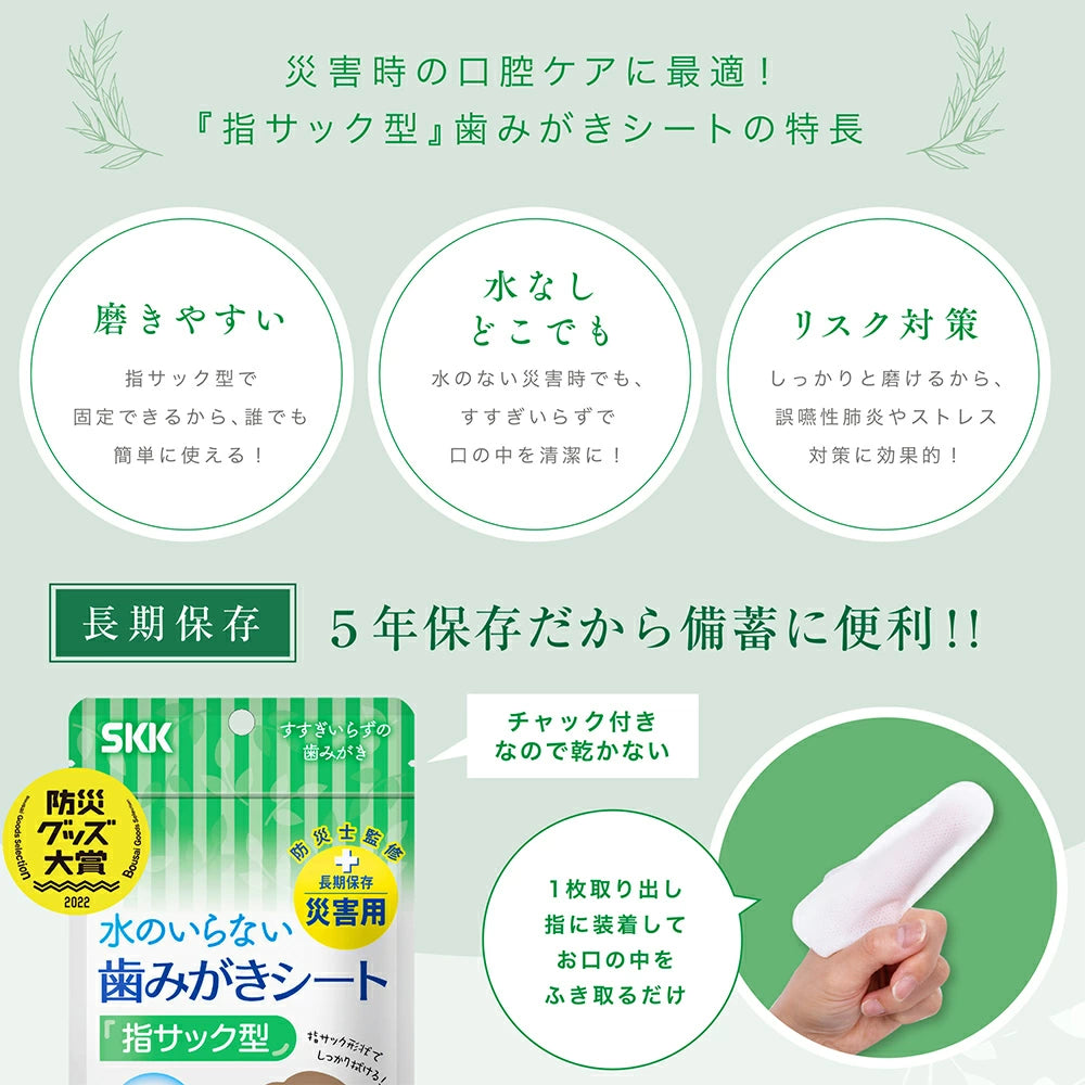 災害時に歯を磨けない環境は、誤嚥性肺炎などの二次災害に繋がります。水のいらない歯みがきシートは、指サック型で使いやすく、災害時や避難所での口腔ケアに最適です。水を使わずに歯を清潔に保つことができ、役立ちます。5年間の長期保存が可能で、防災グッズとして備蓄に適しています。介護やアウトドアでも便利に使用でき、衛生的な口腔環境を維持します。ノンアルコール・無香料で、安心してお使いいただけます。